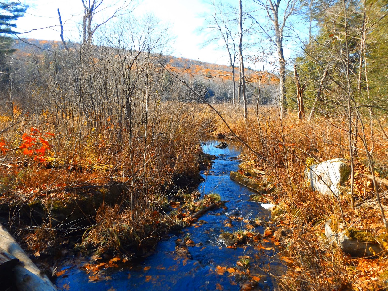 Fall leaves scattered in Higley Brook's waters.A last look at pristine Upper Goose Pond, with the afternoon sun's reflections.