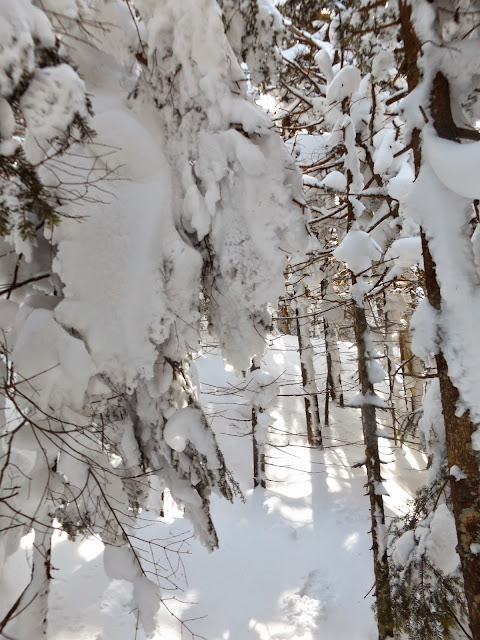 Only a short distance from the summit, the snow was drifted and very deep. Here is a look at the deep snow amongst the trees just off the trail.