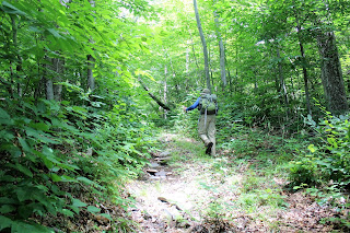 The east side of North Dome is extremely steep, no matter which route you take. The further south you go the steeper it gets, with some areas being unsafe to pass. We found a safe route down, dropping about 1300 feet in about one mile. From there we crossed mostly dried up Mink Hollow Brook, pausing to cool off in the cold mountain water.