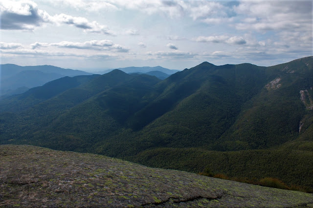 We continued on the trail on a steady descent southwest towards the Feldspar Brook Lean To. It can be frustrating to lose elevation that you had worked hard to attain, but we had to keep dropping down until we could find the second brook crossing, with the slide above. On the way, we had some small viewsup towards Colden's summit some 1500 feet above.