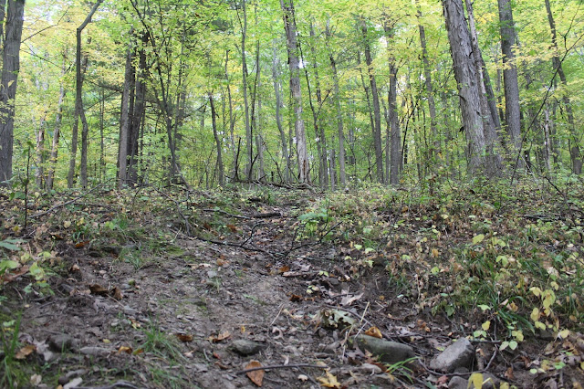 The woods are nearly 100 percent hardwoods and leaves are already beginning to litter the ground. Here is one of two stream crossings at the Preserve, both almost completely dry.