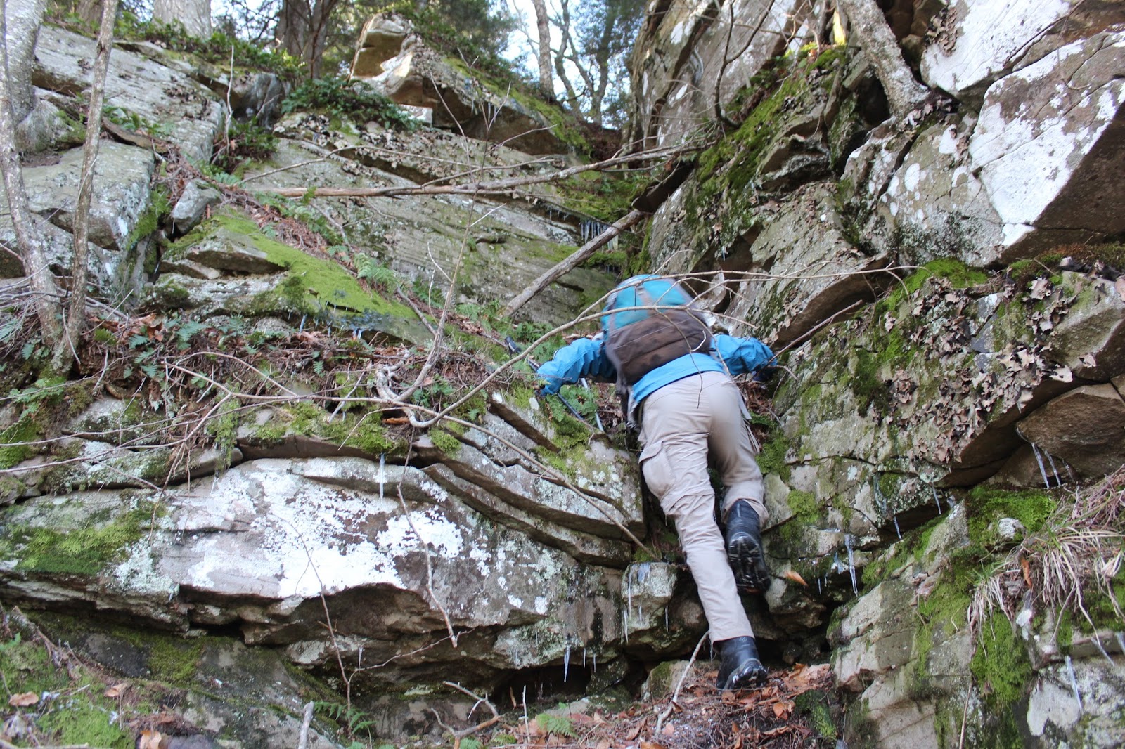 Just below 3800 feet, we arrived at a fairly level table above the ridge. The scene up here was much more wintry, with snow and ice all around. Jim capturing a photo of some large icicles hanging off this rock ledge.