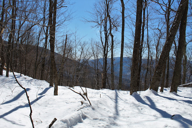 Nearing the summit of Mount Tremper, we found yet another small grove of hemlocks in a hardwood forest.From a small ledge on the north side of the summit, I found this view down towards the valley of the Beaverkill and the hamlet of Willow. Cooper Lake can just be made out over the shoulder of Mount Tobias. The Hudson Valley is way off in the distance.