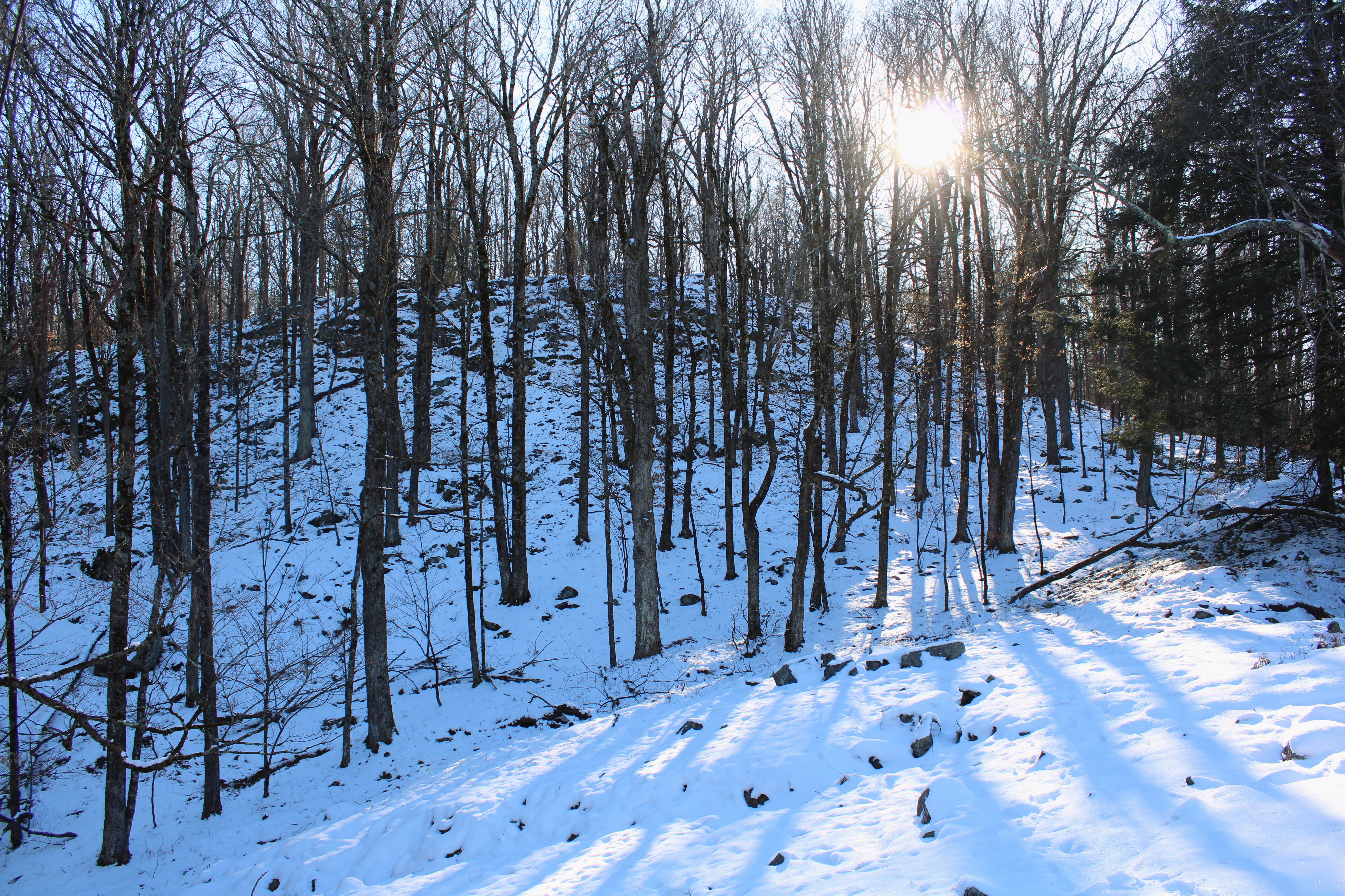 I headed basically NE, crossing over the trail at one point, but maintaining an easy bushwhack climb through a few inches of snow. As I gained the main ridge, I caught filtered views down to the Reservoir and the small peak just SW of the water across Dunham Road.